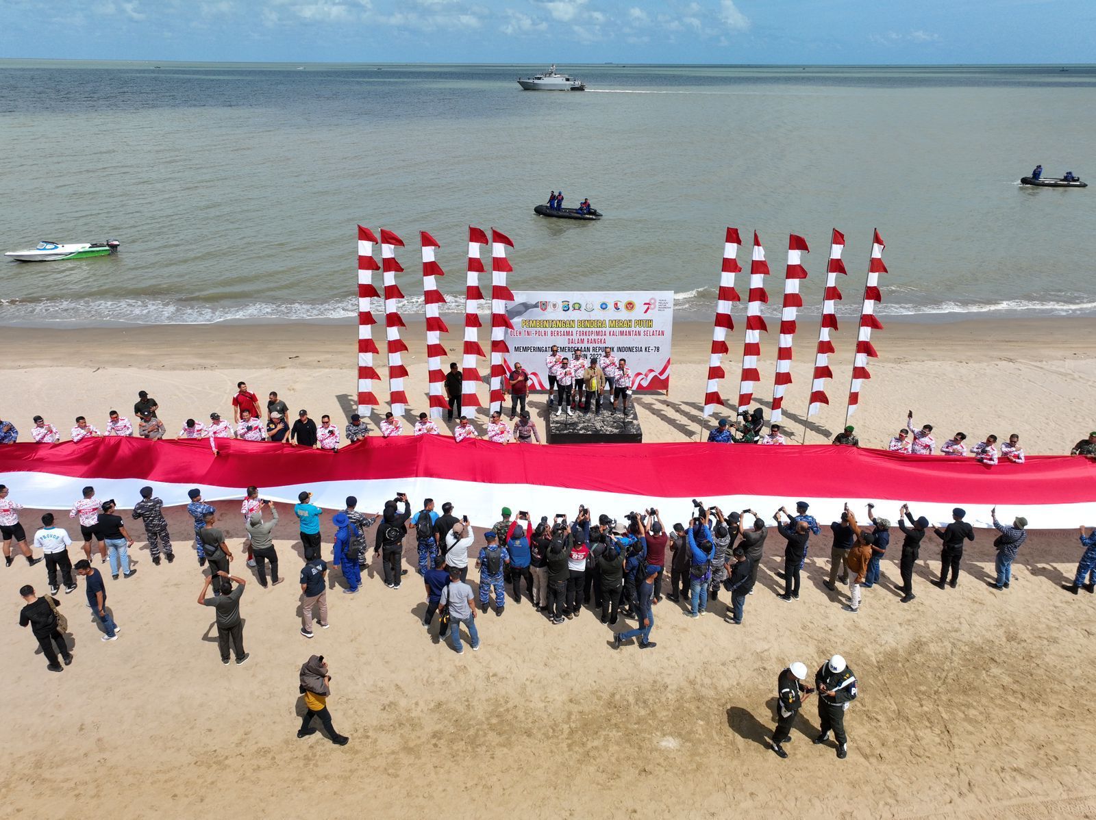 Pembentangan bendera merah putih raksasa tersebut dilakukan oleh prajurit TNI-Polri dan melibatkan unsur Forkopimda Kalsel dan Tala.