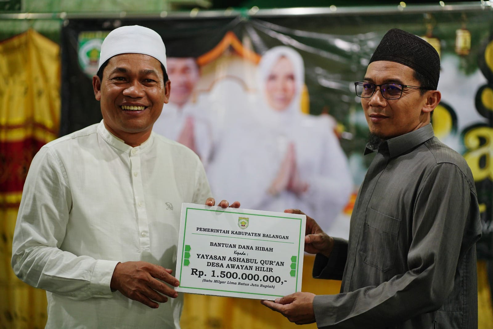 Usai sambutan, kegiatan dilanjutkan dengan penyerahan bantuan dana hibah secara simbolis oleh Bupati Balangan, Abdul Hadi untuk tempat ibadah, Madrasah Ibtidaiyah Swasta Darussalam Awayan dan Yayasan Ashabul Quran sebesar Rp3.850.000.000.