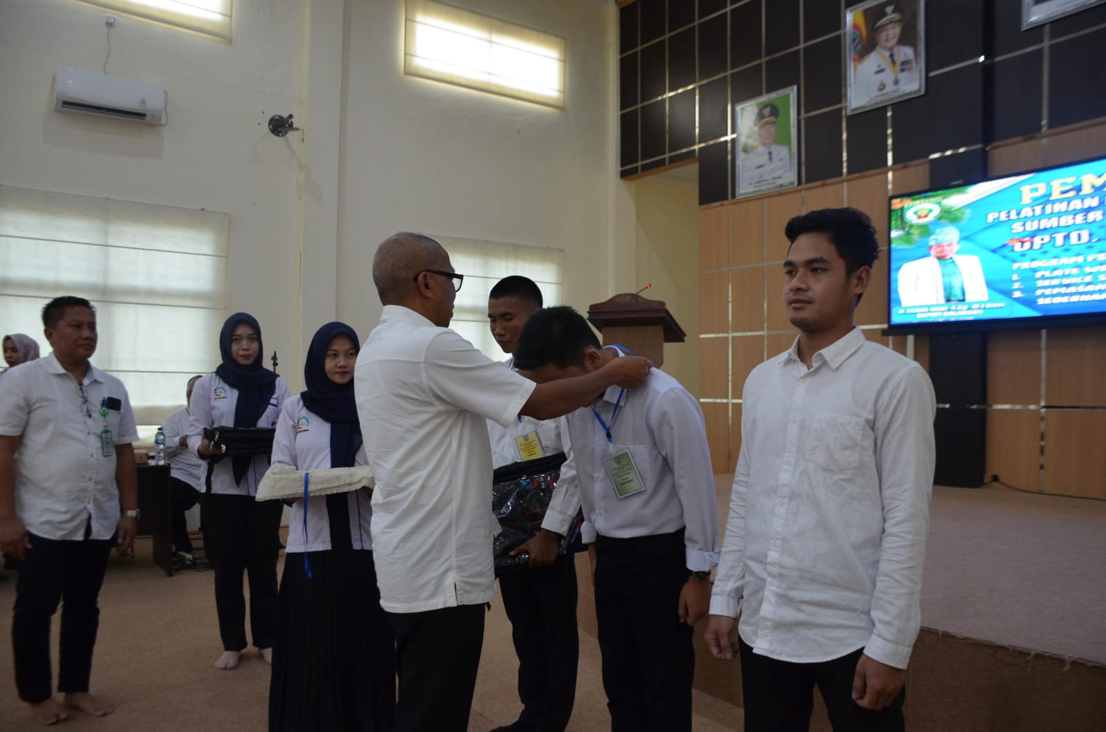Pembukaan pelatihan ditandai dengan pengalungan kartu pengenal beserta kelengkapan pelatihan kepada peserta, oleh Plt. Kepala DKUKMTK Kabupaten Balangan, Abdurrahman Arrahimi, di Aula BLK Balangan, Desa Mampari, Kecamatan Batumandi, Rabu (3/7/2024).