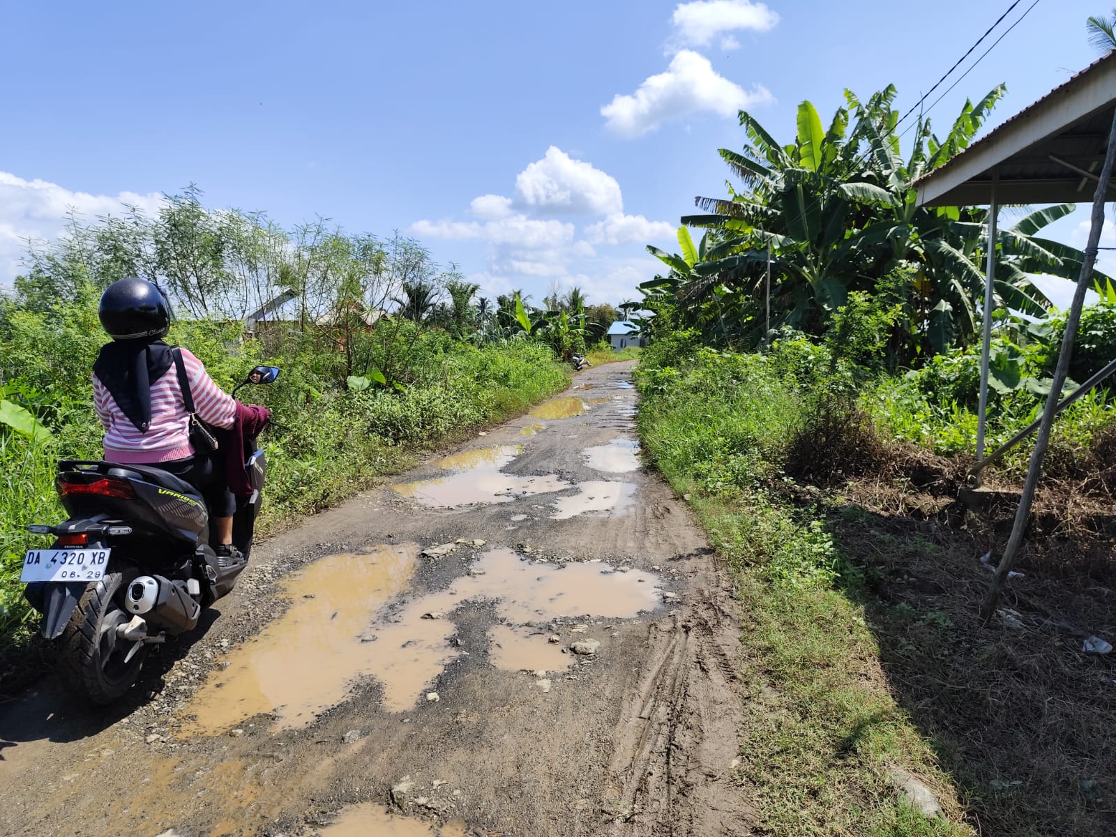 Pemandangan jalan berlubang yang becek dan digenangi air menjadi makanan sehari-hari warga Sungai Madang. Beberapa warga pun mempertanyakan kapan akses jalan mereka diperbaiki.