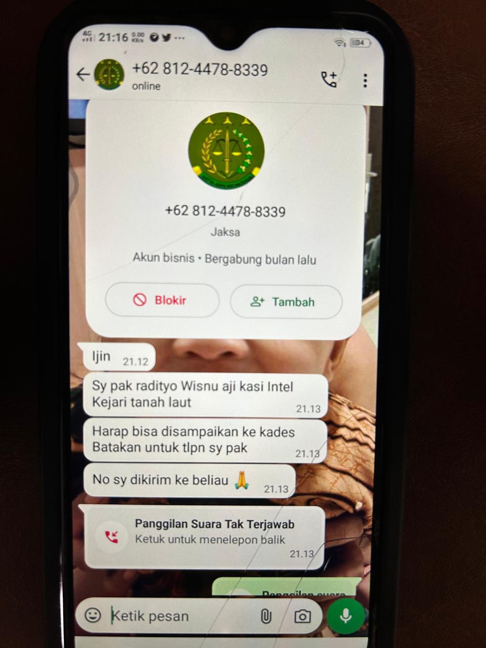 TANAH LAUT, dnusantarapost.com – Salah satu perangkat desa Batakan, Kecamatan Panyipatan mengaku dihubungi oleh seseorang yang mengaku sebagai Kasi Intelijen Kejaksaan Negeri (Kejari) Tanah Laut (Tala), Radtyo Wisnu Aji.