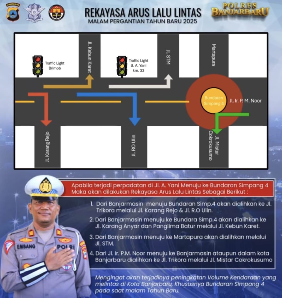 “Kami juga mengimbau kepada masyarakat agar tidak melakukan perayaan Malam Tahun Baru 2025 di kawasan Simpang Empat Banjarbaru agar tidak menyebabkan kemacetan,” ujar AKP Embang Pramono. (nurul octaviani)
