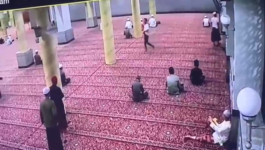 Dari rekaman CCTV, terlihat terduga pelaku mengenakan kaos berwarna putih memasuki area masjid, kemudian ia melarikan diri usai melakukan perbuatannya.