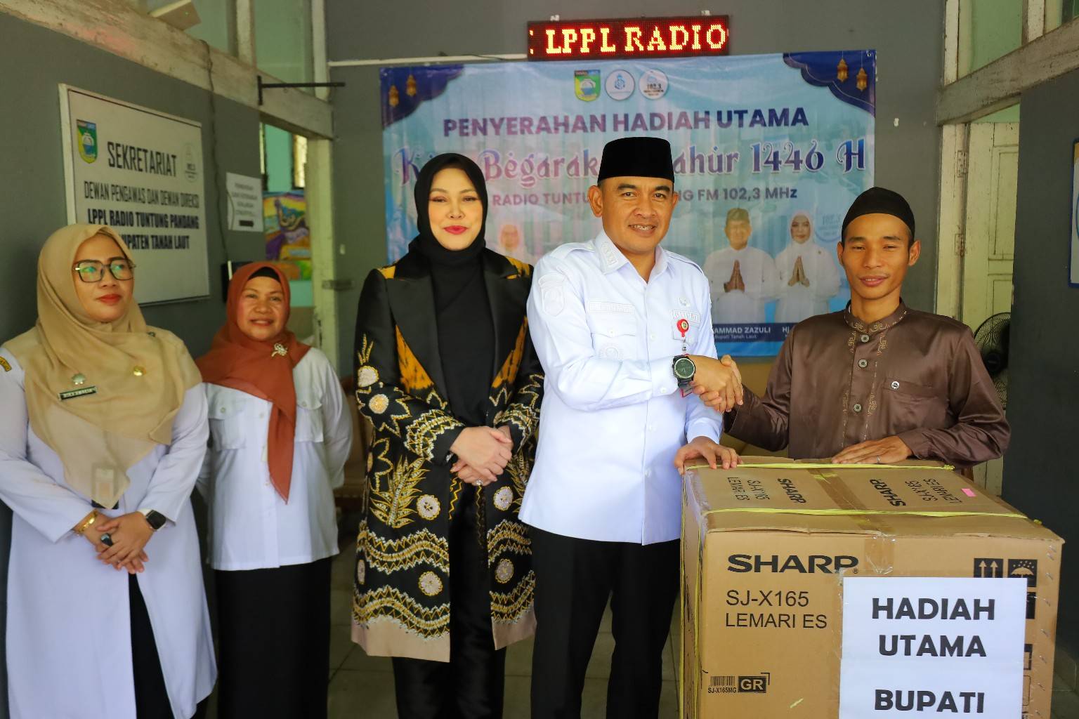 Pelaihari – Bupati Tanah Laut (Tala), H. Rahmat Trianto, membagikan hadiah kepada pemenang Kuis Bagarakan Sahur LPPL Radio Tuntung Pandang pada Rabu (26/03/2025). Acara berlangsung di teras depan Studio LPPL Radio Tuntung Pandang.