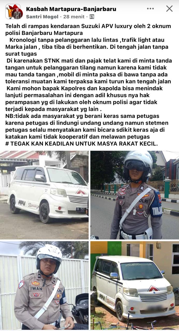“Telah di rampas kendaraan Suzuki APV luxury oleh 2 oknum polisi Banjarbaru Martapura. Kronologi tanpa pelanggaran lalu lintas, trafik light atau marka jalan, tiba tiba di berhentikan di tengah jalan tanpa surat tugas,” bunyi tulisan di postingan medsos Facebook yang diunggah oleh akun Santri Mogol.