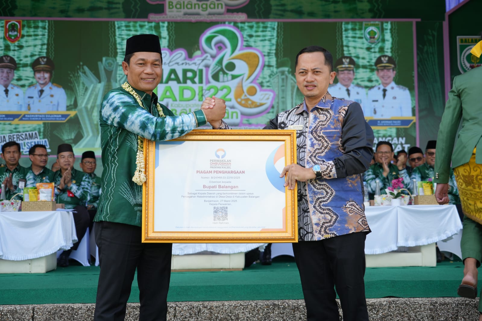 Dalam Puncak Peringatan Harjad Balangan ke-22, Bupati Abdul Hadi Terima Penghargaan dari Ombudsman RI