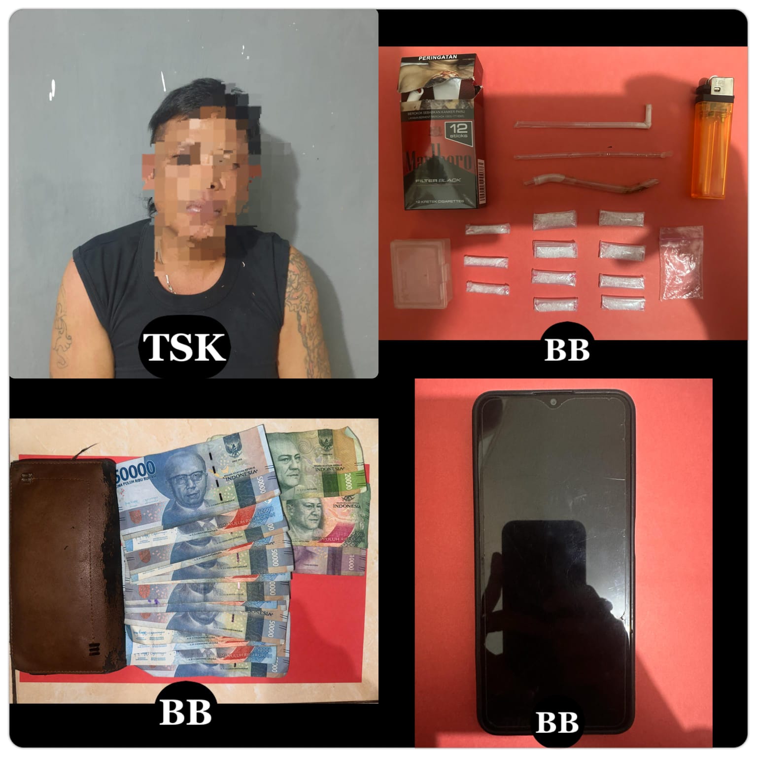 Dari hasil penggeledahan, petugas menemukan sejumlah barang bukti, di antaranya sebelas paket sabu-sabu dalam plastik klip dengan berat kotor 3,65 gram dan berat bersih 1,45 gram, sejumlah alat hisap sabu, serta satu unit handphone yang diduga digunakan untuk transaksi.