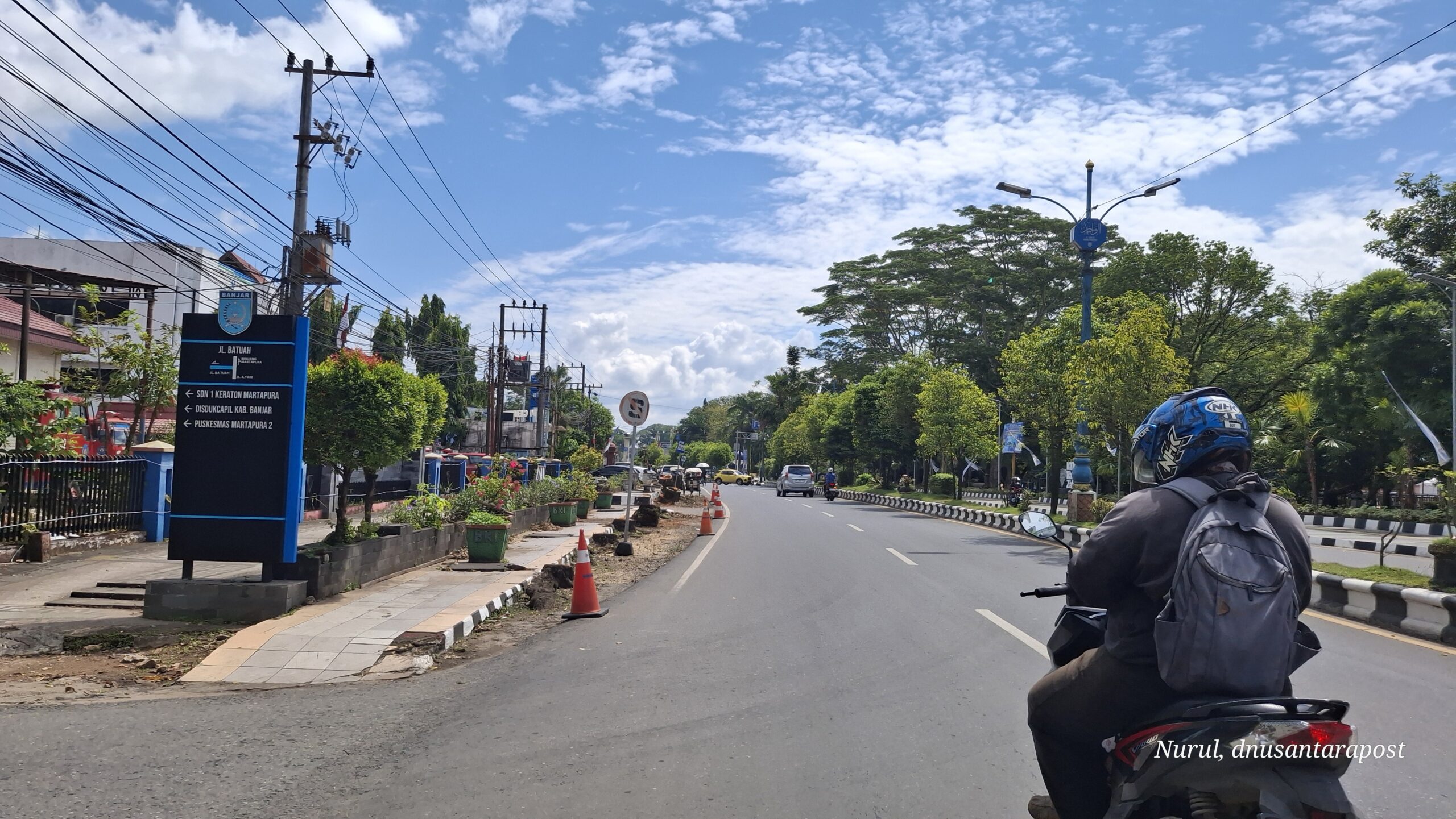 Tak ada lagi bayangan pepohonan yang dulunya menjadi pelindung dari sengatan matahari. Bahkan, dalam foto yang diambil dari arah Jalan Batuah, tampak seorang pengendara motor melintasi ruas jalan yang kini minim naungan, sementara sisi trotoar dipenuhi bekas potongan akar dan tanda proyek.