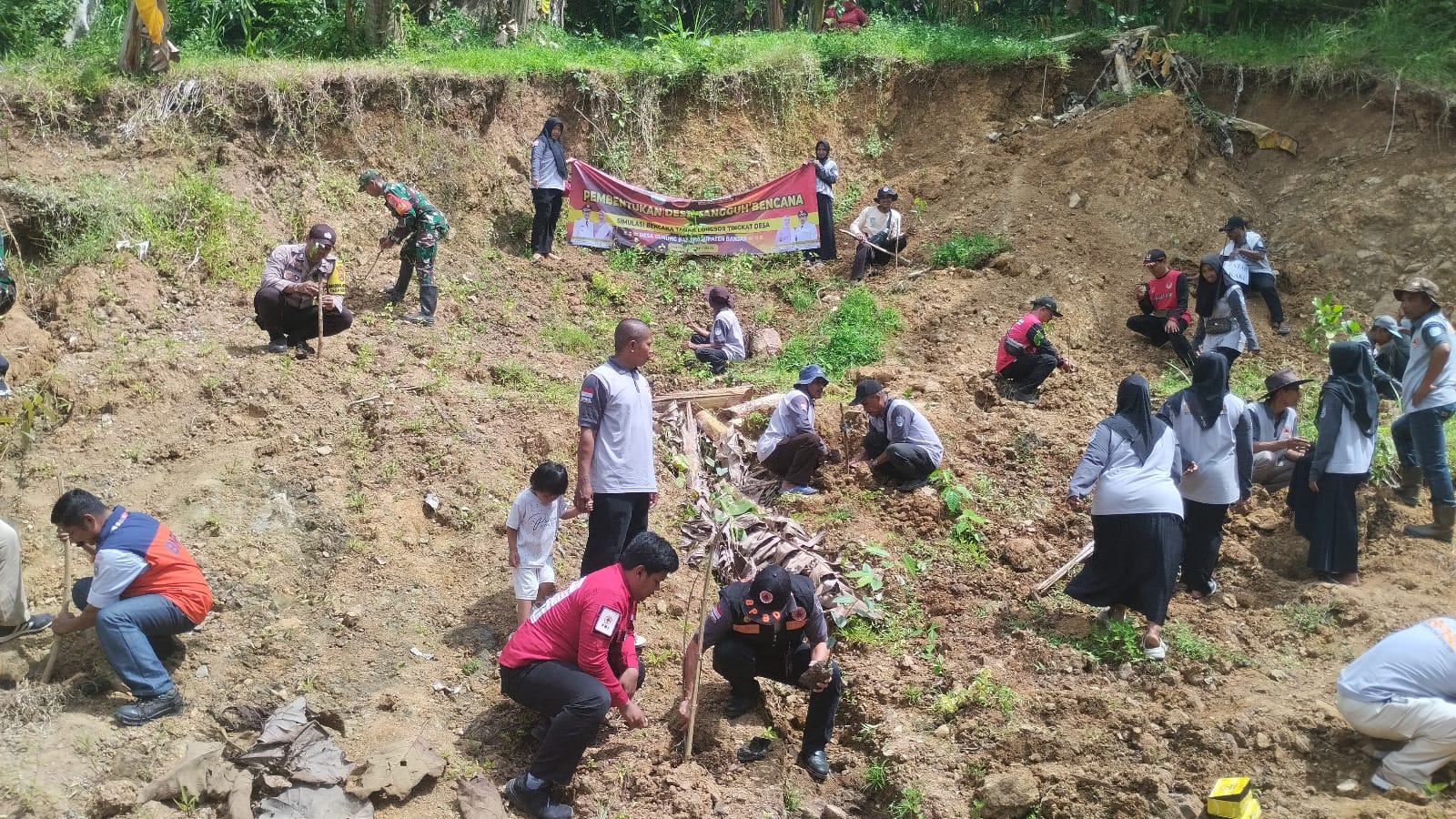 Sebanyak 500 bibit pohon ditanam di lereng rawan longsor pada Kamis (10/7/2025), sebagai bagian dari kegiatan penutupan program Desa Tangguh Bencana (Destana) 2025.