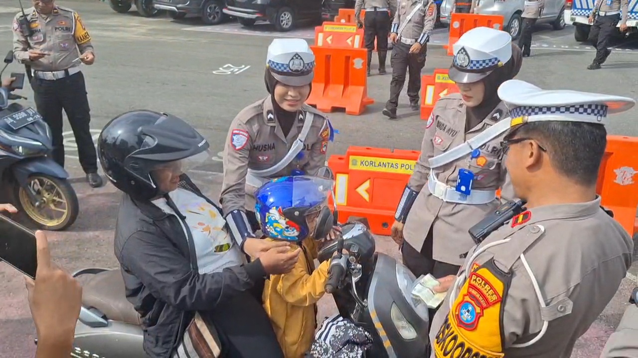 Terlihat dari sikap anggota Satlantas Polres Banjarbaru yang memberikan helm untuk pengendara yang membonceng anaknya untuk menunjang keselamatan penumpang dan pengendara.