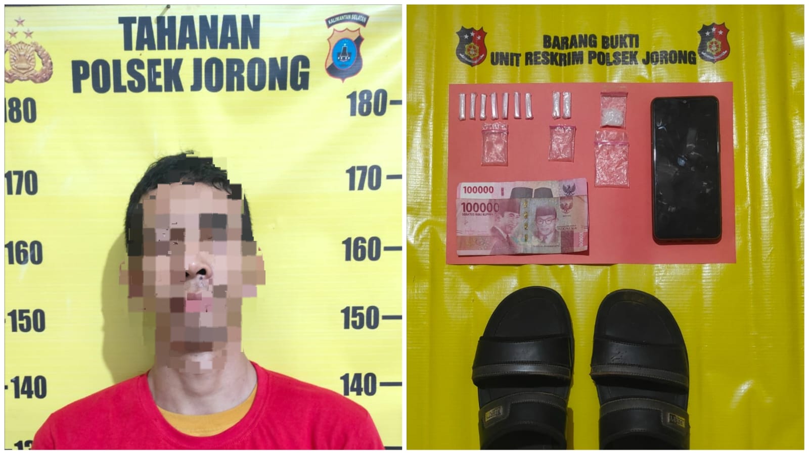 Namun, saat pemeriksaan lebih lanjut di Polsek Jorong juga menemukan sepuluh paket narkotika jenis sabu yang terjatuh dari sandal yang digunakan pelaku.