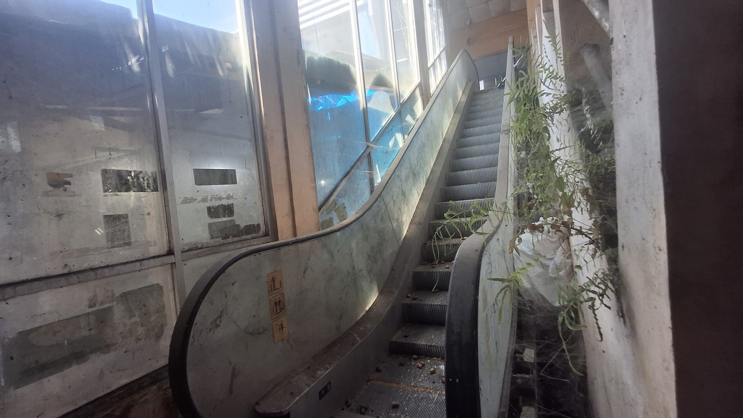 Eskalator ini dipenuhi sampah dan dedaunan bahkan serpihan kaca yang menandakan bahwa sudah tidak berfungsi dalam waktu yang cukup lama. Dinding di sekitarnya pun tampak kusam dan ditumbuhi tanaman liar dengan kondisi kaca di sekitar yang memudar bahkan ada yang pecah.