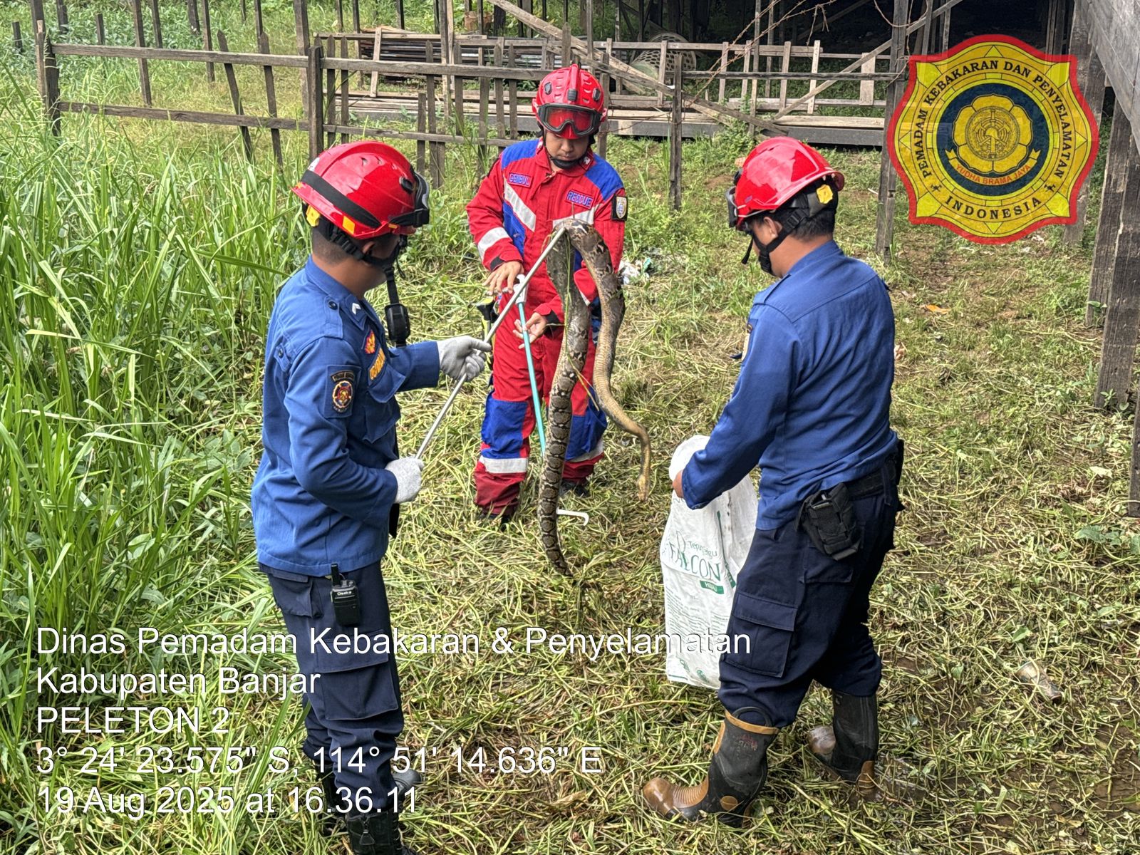 MARTAPURA, dnusantarapost.com – Petugas Dinas Pemadam Kebakaran dan Penyelamatan (DPKP) Kabupaten Banjar kembali melakukan aksi penyelamatan hewan berbahaya. Dalam sehari, Selasa (19/8/2025), tim Damkar berhasil mengevakuasi dua ekor ular di dua lokasi berbeda.