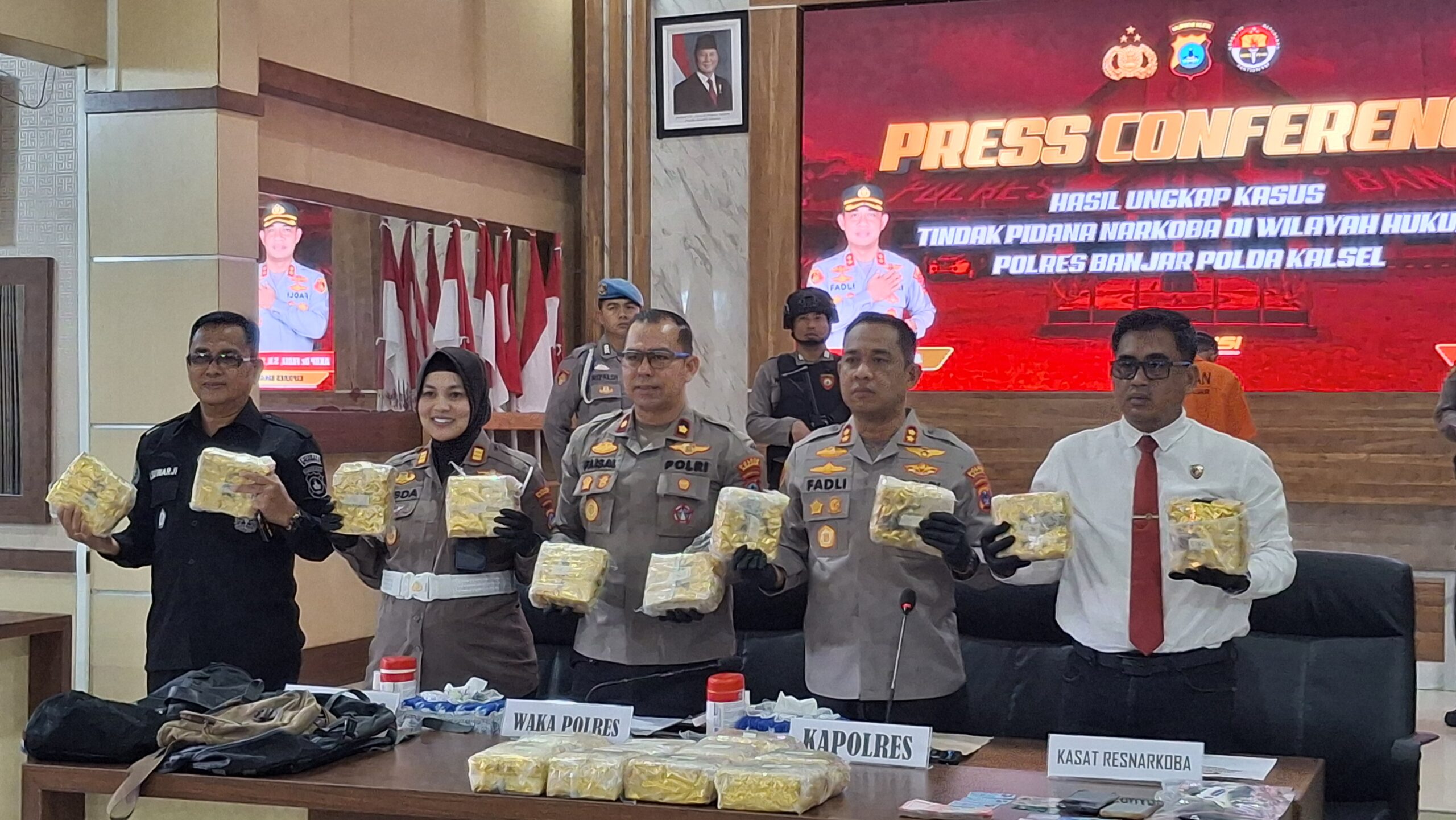 MARTAPURA, dnusantarapost.com – Polres Banjar berhasil menyita 19 kilogram narkotika sabu-sabu dari seorang kurir berinisial S (38) asal Sidoarjo pada Kamis (11/9/2025) sore sekitar pukul 16.30 WITA di Jalan Gubernir Syarkawi, Gambut, Kabupaten Banjar.