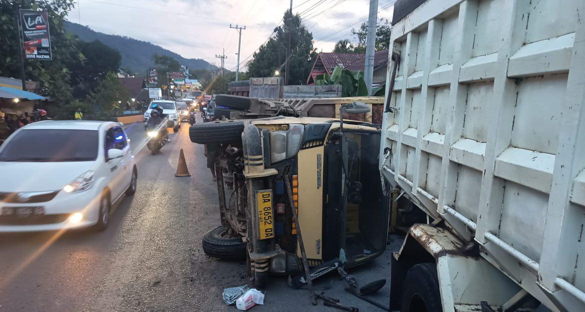 MARTAPURA, dnusantarapost.com — Sebuah truk dilaporkan terguling di Jalan Ir. Muhammad Noor, Desa Mandiangin Timur, Kecamatan Karang Intan, pada Minggu (23/11/2025) sekitar pukul 17.43 Wita.