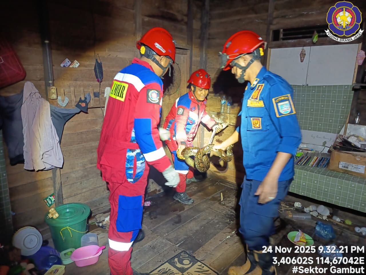 GAMBUT, dnusantarapost.com– Suasana mencekam menyelimuti sebuah rumah warga di Jl. A. Yani Km 14 Gg. Mulia, Kecamatan Gambut, Kabupaten Banjar, Senin (24/11/2025) malam. Sebuah ular piton berukuran sekitar 3,5 meter ditemukan melata di area dapur, membuat penghuni rumah dan warga sekitar panik.