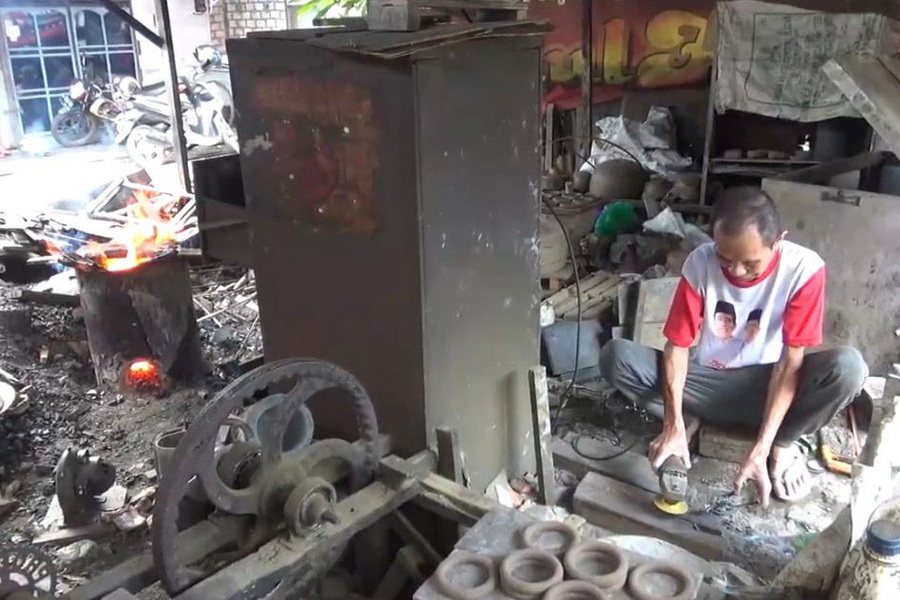Di bengkel kecil seluas 63 meter persegi, ia melakukan seluruh proses produksi mulai dari awal hingga akhir. Kuningan dilelehkan di tungku api tradisional, lalu dituangkan ke cetakan tanah liat. Setelah itu, bagian-bagian tertentu masih memerlukan pengukiran manual agar detailnya sesuai permintaan.
