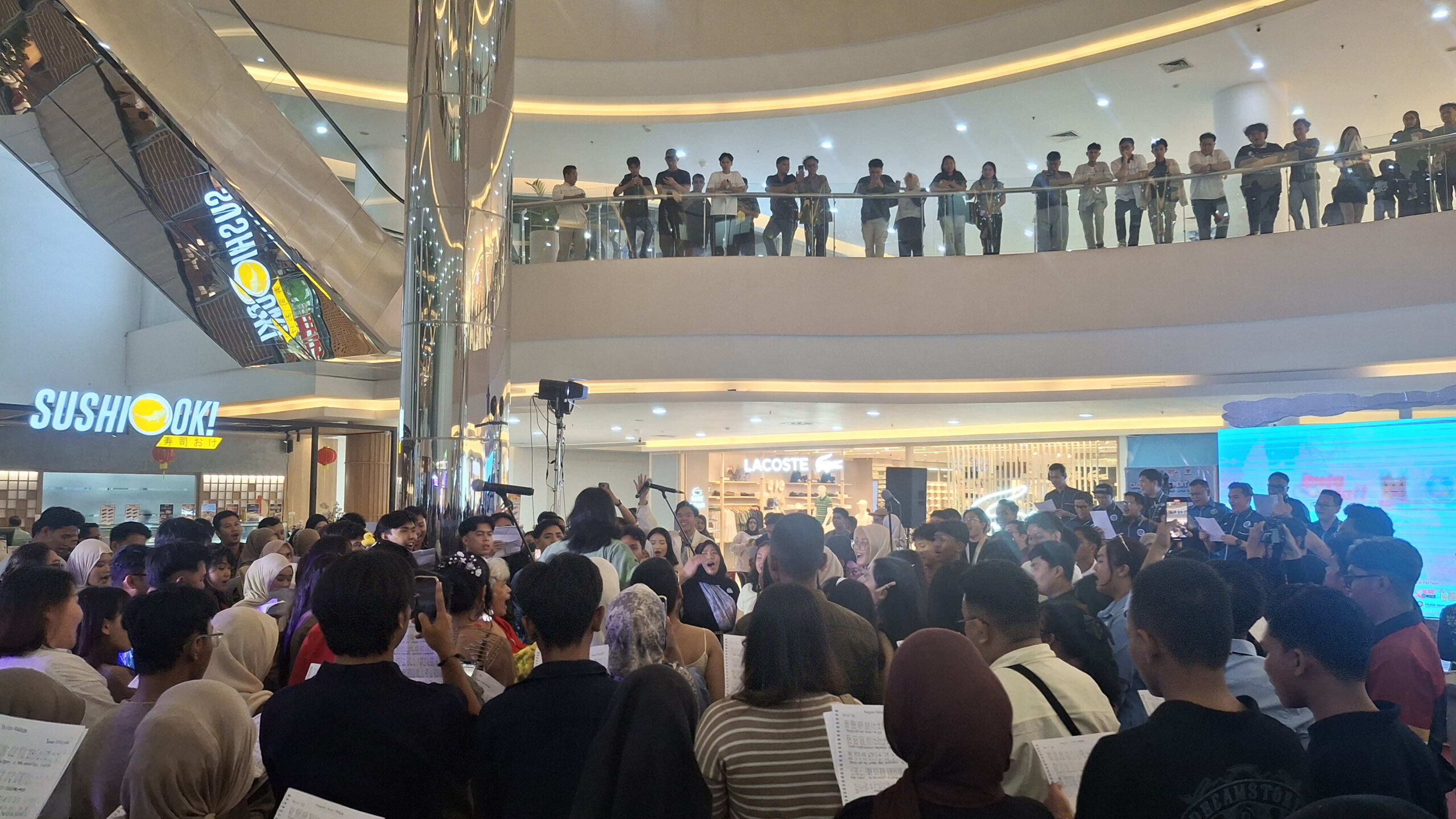 Sejak sore hari, area Atrium 2 dipadati pengunjung yang datang untuk menikmati konser amal sekaligus berdonasi. Alunan musik dan nyanyian menggema di dalam gedung mal, menciptakan suasana hangat dan penuh kebersamaan.